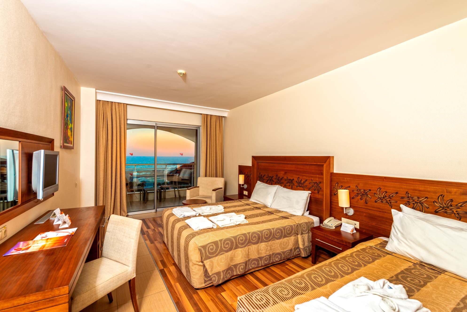 Camerele acestui hotel sunt dotate modern cu parchet laminat, aer conditionat, TV LCD, telefon si minibar, baie proprie cu dus, uscator de par, balcon, aparat set ceai/cafea, aer conditionat, seif, set necesar baie.